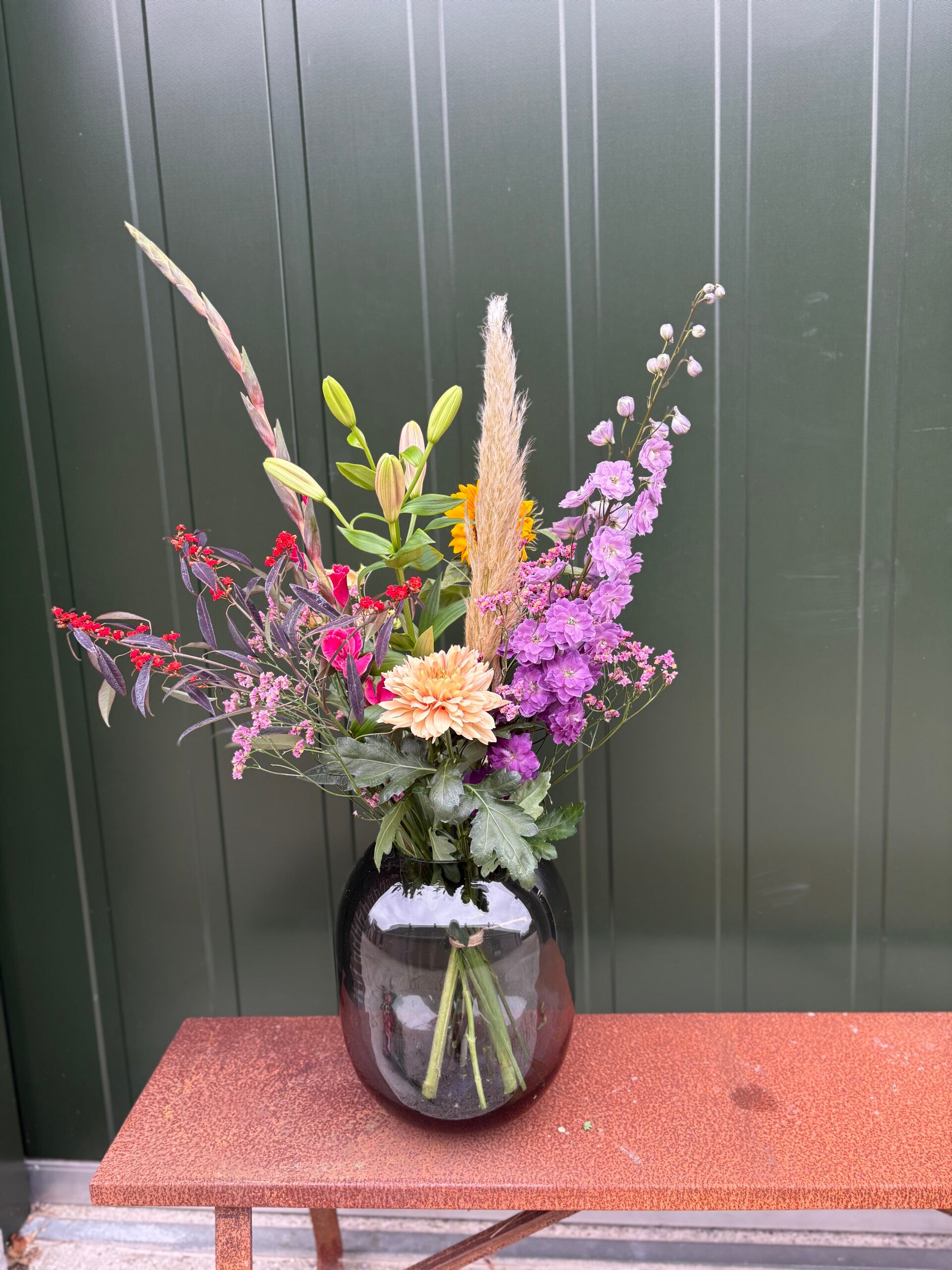 Een boeket met verschillende soorten bloemen geschikt op een natuurlijke manier met diepte werking. Zo komt er echt een vrolijke en speelse bos op tafel.