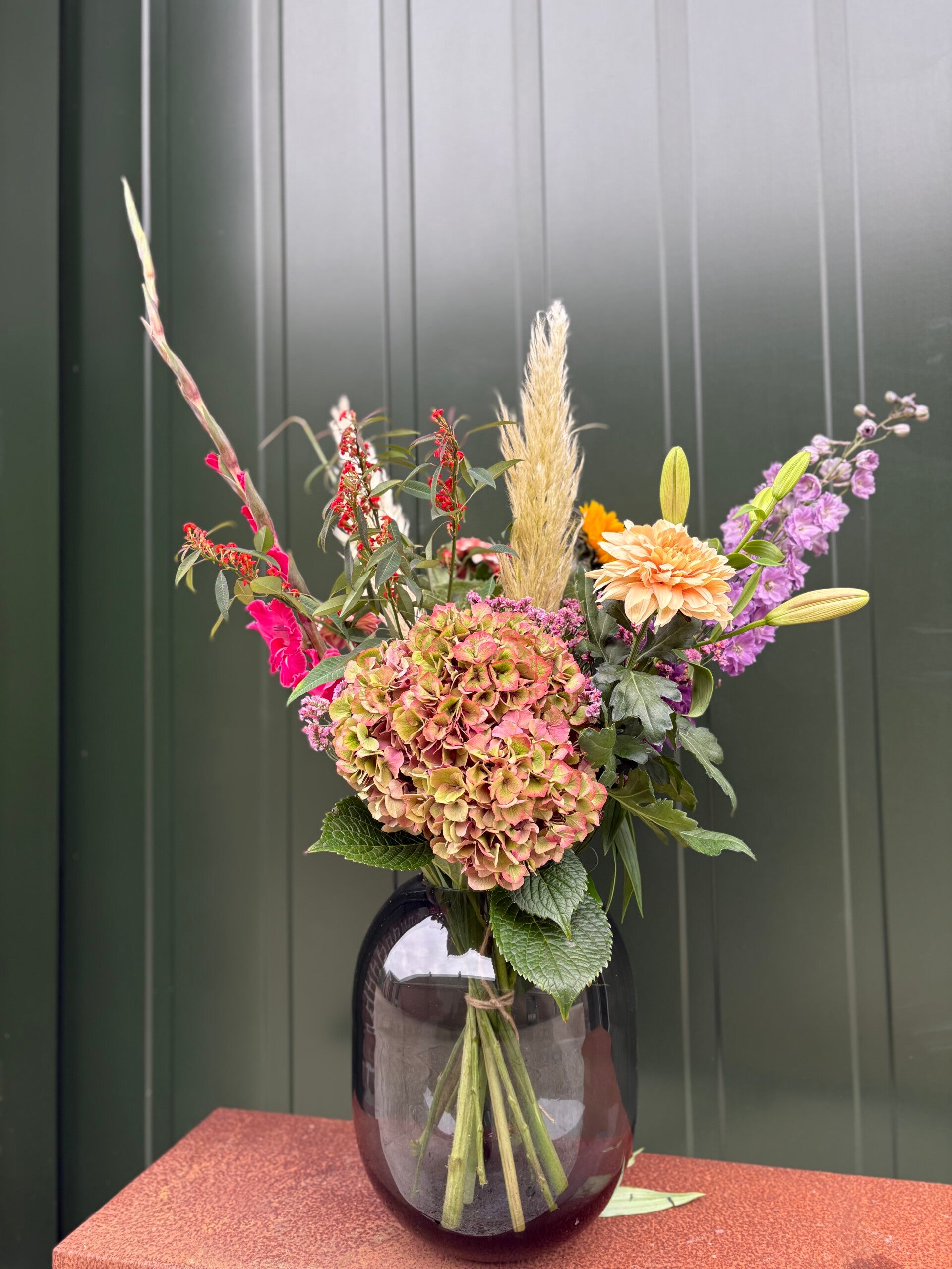 Een boeket met verschillende soorten bloemen geschikt op een natuurlijke manier met diepte werking. Zo komt er echt een vrolijke en speelse bos op tafel.
