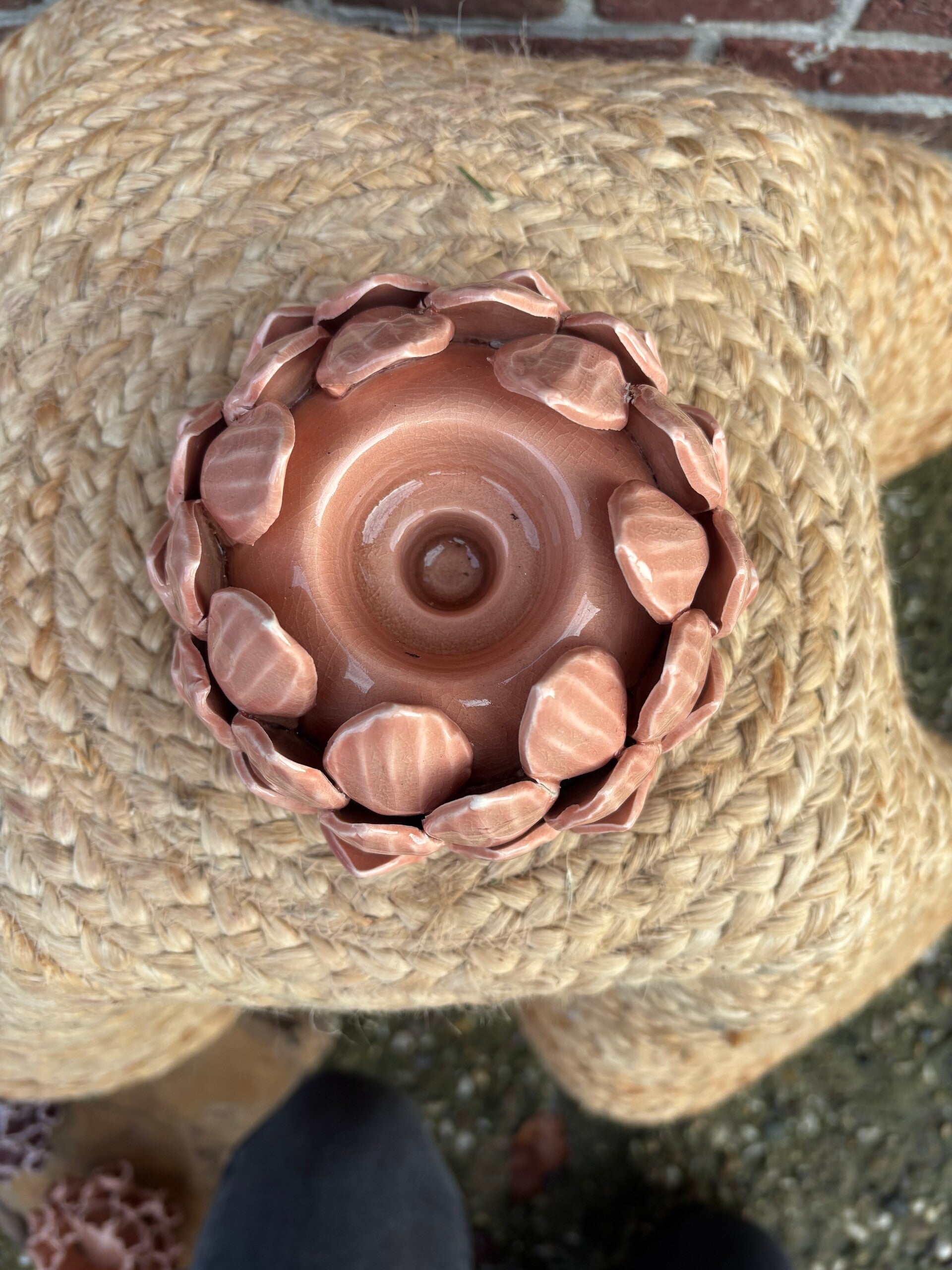 Aardewerken kaarsenhouder in de vorm van een dahlia in de kleur taupe. Te gebruiken met 2 soorten kaarsen: diner kaars en waxine